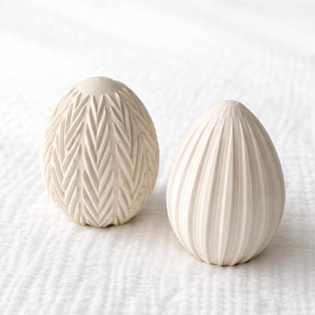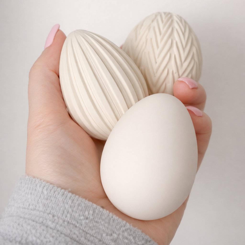 Matný, sametový povrch a přírodní odstín působí měkce a přirozeně. Vajíčka krásně vyniknou samostatně na poličce, v misce na stole, či jako součást jarní dekorace. Díky svému střídmému vzhledu nepůsobí pouze sezónně - stanou se designovým prvkem, který můžete ponechat ve svém domově po celý rok.