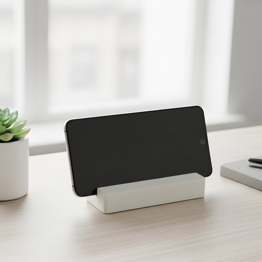 Díky své hmotnosti stojí pevně na místě a bezpečně udrží telefon při sledování videí, videohovorech nebo prostě při odložení telefonu. Hladký povrch s jemně matným efektem působí přirozeně a doplní každý interiér, od pracovny po noční stolek.