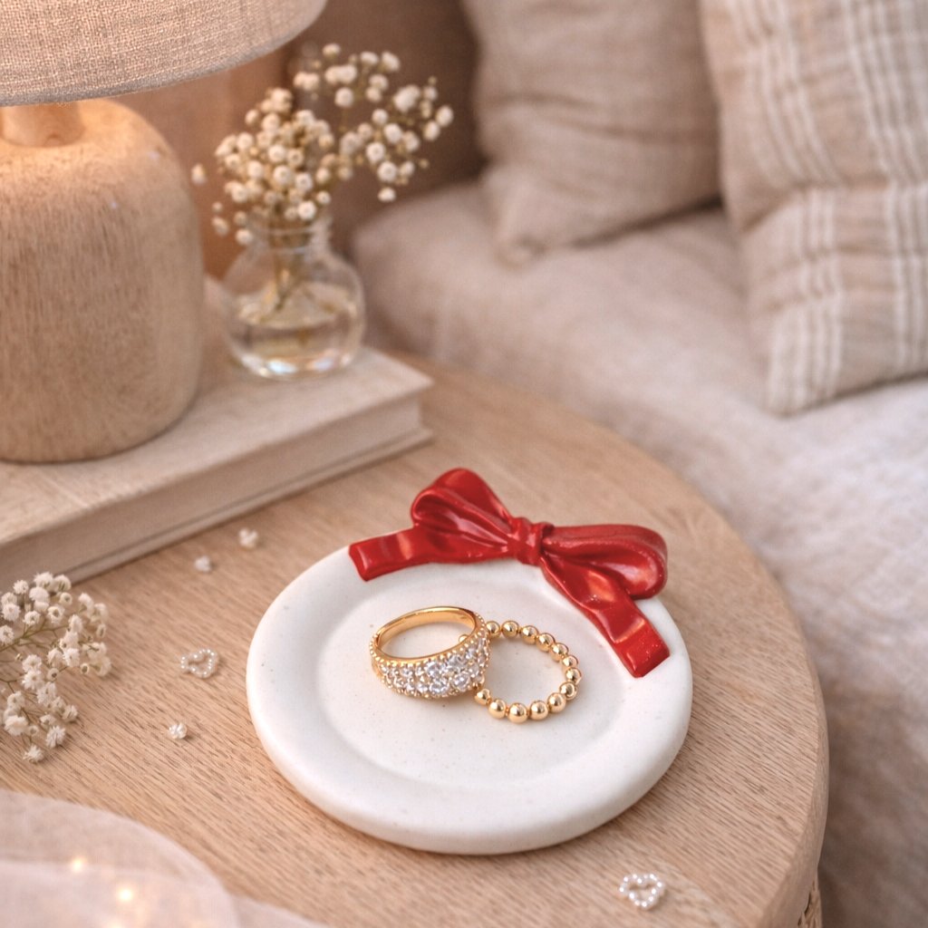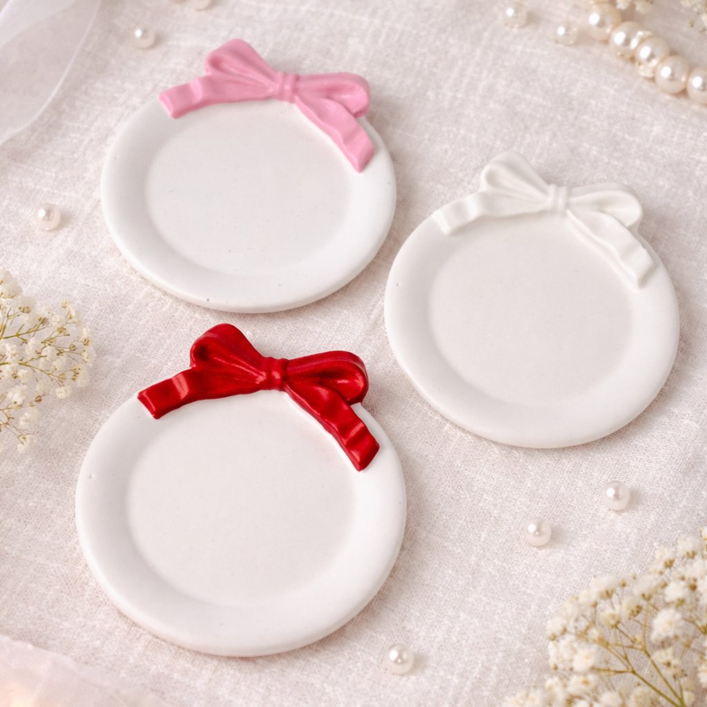 Ručně vyráběný tácek z jesmonitu s výraznou mašličkou je drobným, ale působivým detailem, který vnese do interiéru špetku romantiky. Jeho jednoduchý kulatý tvar v kombinaci s mašlí dodává celku hravý a slavnostní nádech. Spojuje krásu, funkčnost a ruční výrobu do jednoho kousku.