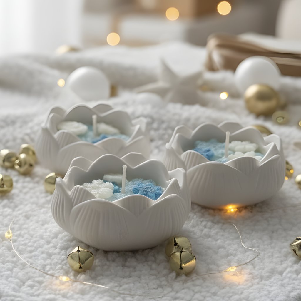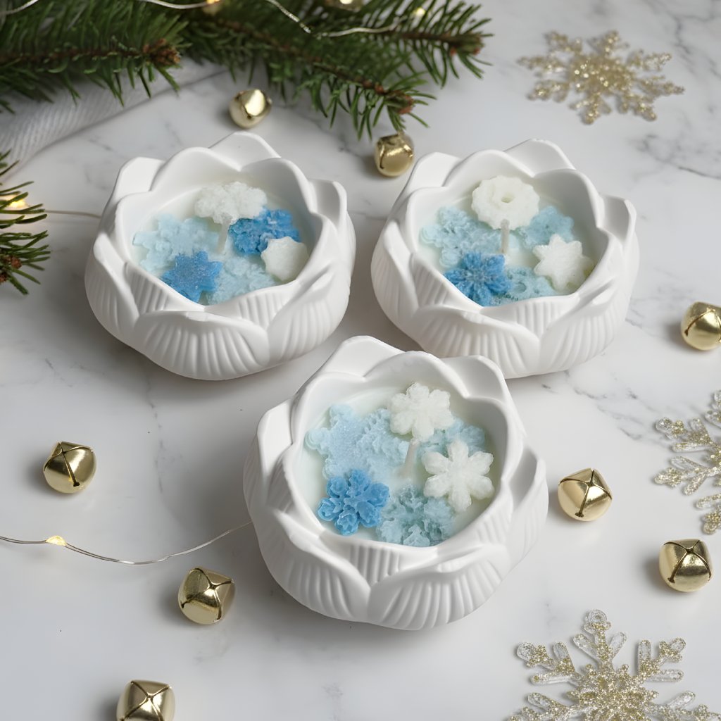 Zimní kouzlo zachycené v elegantní bílé dóze z jesmonitu a jemnými liniemi, které podtrhují čistý a sofistikovaný vzhled. Uvnitř se ukrývá ručně odlévaná sójová svíčka, zdobená drobnými sněhovými vločkami v tónech bílé a ledově modré.